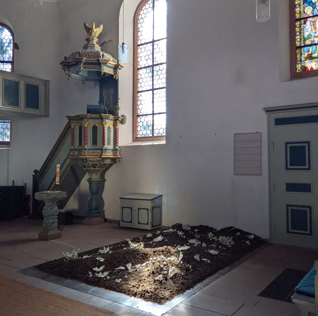 Vom Werden und Vergehen 2024 porcelain, Bruchenbrücken soilPorzellan, Bruchenbrückener Erde L 400cm B/W 250cm H40cm KUNST IN KIRCHEN IN DER WETTERAU, Evangelische Kirche Bruchenbrücken